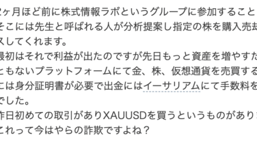 気になるネット上の口コミ(ヤフー知恵袋)2ヶ月ほど前に株式情報ラボというグループに参加することになりました。そこには先生と呼ばれる人が分析提案し指定の株を購入売却のタイミングをアナウンスしてくれます。最初はそれで利益が出たのですが先日もっと...