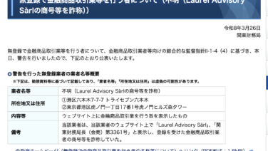 金融庁から警告 Laurel Advisory Sàrlに注意、金融庁から警告