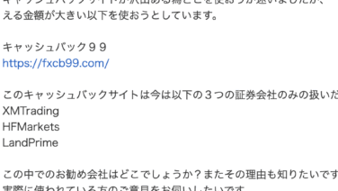 FX キャッシュバック99(https://fxcb99.com/)、XMTrading、HFMarkets、LandPrimeの気になる口コミ 気になるネット上の口コミ(ヤフー知恵袋)海外のFX証券会社について質問です。私は海外の証券会社は使った事がありません。最近になってキャッシュバックサイトを通して海外FX口座を開設すれば、その口座で取引した分のキャッシュバックが貰えるという事... 2025.10.03 FX