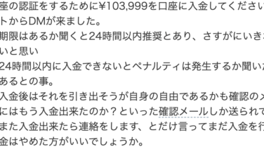 投資 fiverr.comを騙るDMに注意 気になる口コミ(ヤフー知恵袋より)fiverr.comについて、外貨を稼ごうと思い登録したのですが取引をするにあたって口座の認証をするために¥103,999を口座に入金してくださいとfiverrカスタマーサポートからDMが来ました。期限はあ... 2026.05.01 投資