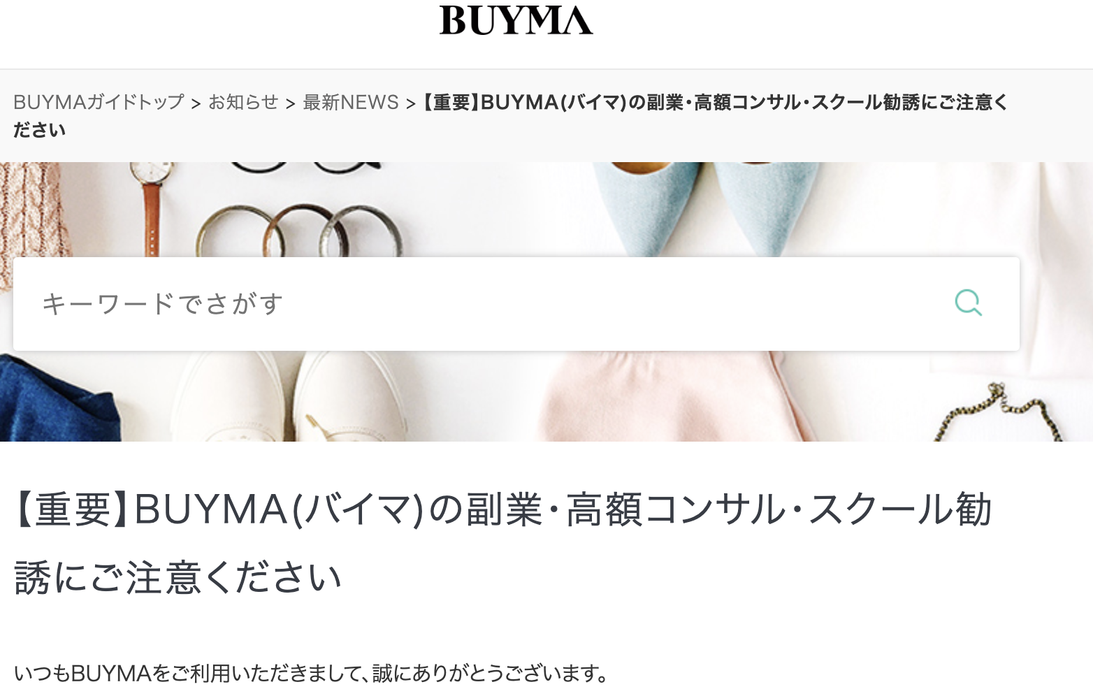 ※引用 【重要】BUYMA(バイマ)の副業・高額コンサル・スクール勧誘にご注意ください(qa.buyma.com/information/news/30118.html)