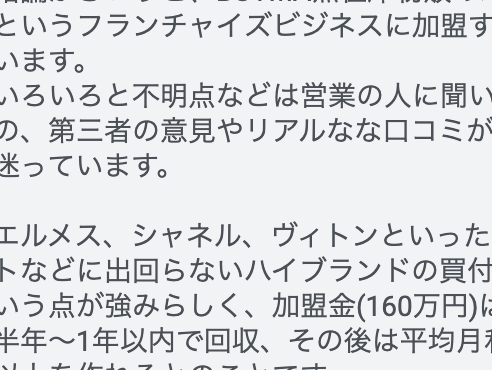 エルメス、シャネル、ヴィトンといったアウトレットなどに出回らないハイブランドの買付ができるという点が強みらしく、加盟金(160万円)はだいたい半年〜1年以内で回収、その後は平均月利益50万円以上を作れるとのことです。