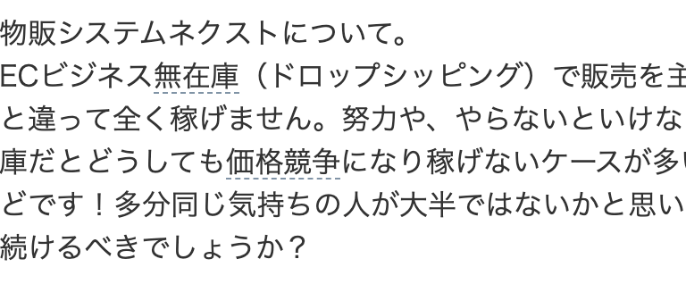 つまり、株式会社NEXTの物販システムネクスト、ECビジネス無在庫(ドロップシッピング)は、実際に参加しても、同じコミュニティに参加している人が容易に競合となってしまうため、利益を出すことは極めて難しいビジネスモデルと言わざるを得ません。