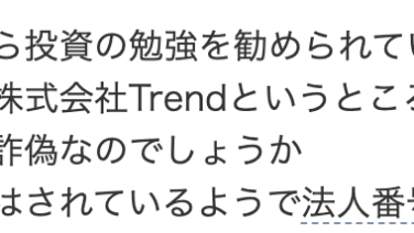 気になるネット上の口コミ(ヤフー知恵袋)友人から投資の勉強を勧められています会社は株式会社Trendというところらしいのですが少し怪しいと思いますこれは詐偽なのでしょうか法人化はされているようで法人番号が6010401190771ですモノ無...