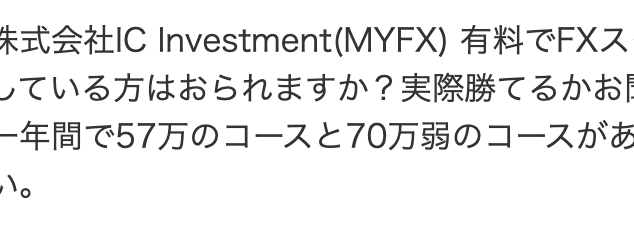 株式会社IC lnvestment(MYFX) 有料でFXスクールを大阪で運営している会社に入会している方はおられますか?実際勝てるかお聞きしたいです。