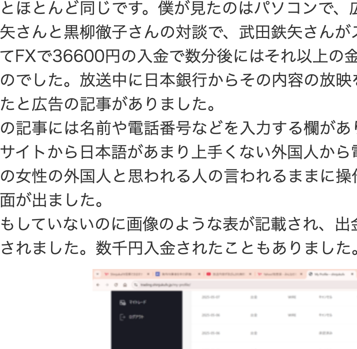 僕が見たのはパソコンで、広告があったのです。武田鉄矢さんと黒柳徹子さんの対談で、武田鉄矢さんがスマートフォンを片手に持ってFXで36600円の入金で数分後にはそれ以上の金額の利益が得られるというものでした。放送中に日本銀行からその内容の放映を中止するように連絡があったと広告の記事がありました。
