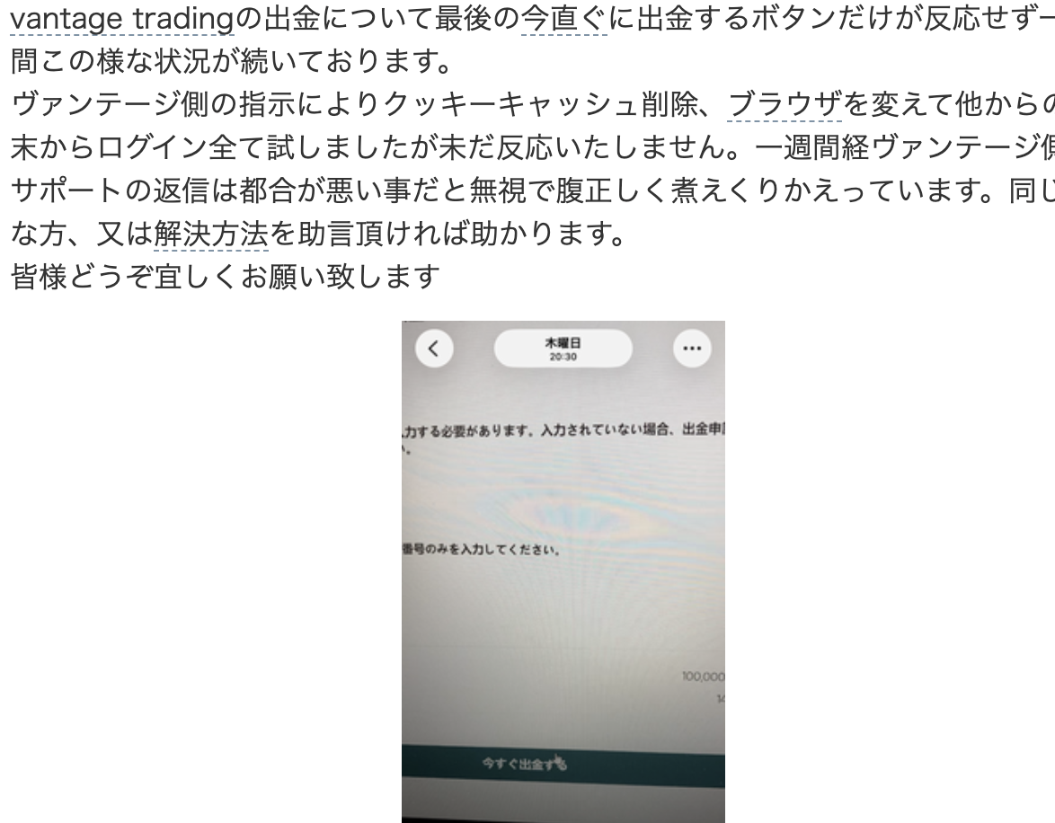 vantage tradingの出金について最後の今直ぐに出金するボタンだけが反応せず一週間この様な状況が続いております。