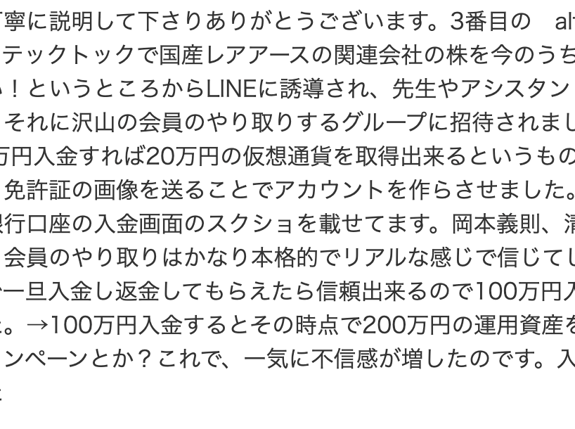 テックトックで国産レアアースの関連会社の株を今のうちに取得するしかない!というところからLINEに誘導され、先生やアシスタント、サポート担当、それに沢山の会員のやり取りするグループに招待されまして、とりあえず10万円入金すれば20万円の仮想通貨を取得出来るというもので、私の個人情報、免許証の画像を送ることでアカウントを作らさせました。会員たちは各自の銀行口座の入金画面のスクショを載せてます。岡本義則、清水柚月という先生と会員のやり取りはかなり本格的でリアルな感じで信じてしまいました。それで一旦入金し返金してもらえたら信頼出来るので100万円入金すると伝えました。→100万円入金するとその時点で200万円の運用資産を持つことになるキャンペーンとか?これで、一気に不信感が増したのです。入金した分は戻りました