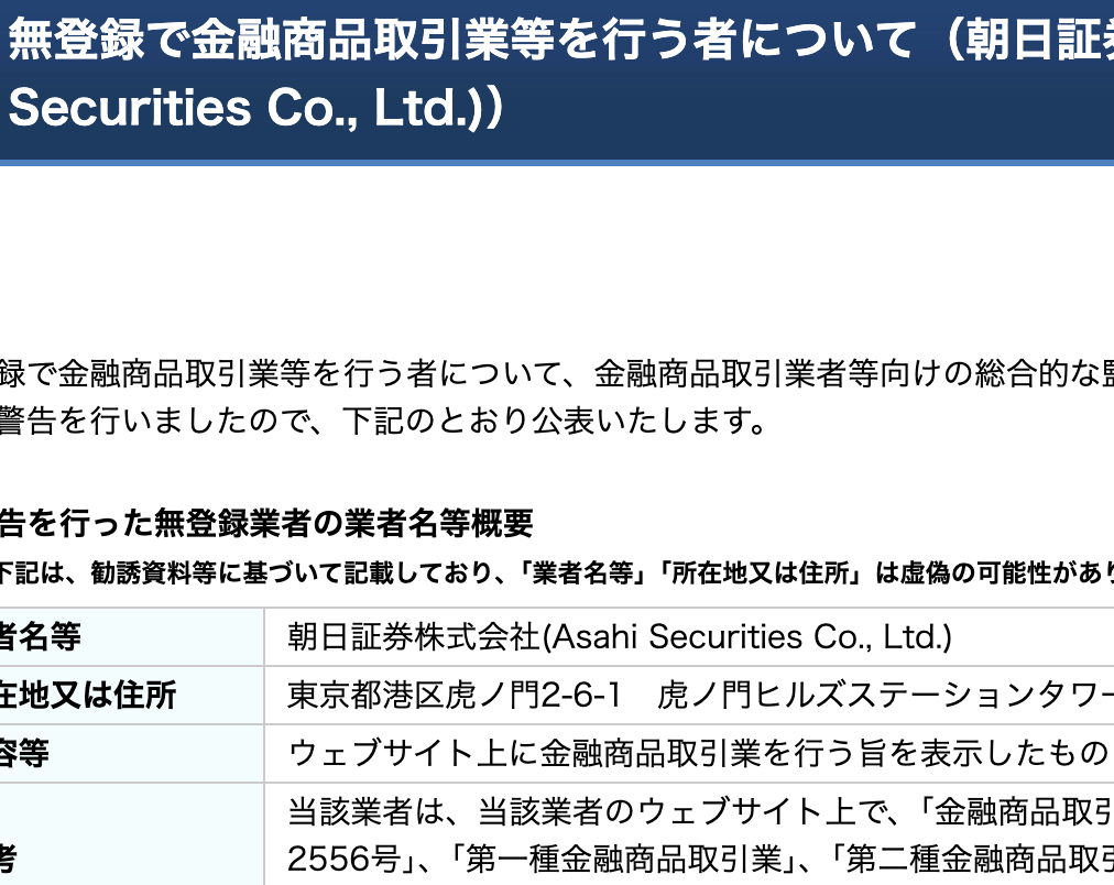 無登録で金融商品取引業等を行う者について(朝日証券株式会社(Asahi Securities Co., Ltd.))