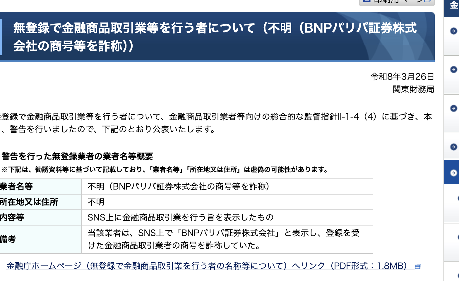 無無登録で金融商品取引業等を行う者について(不明(BNPパリバ証券株式会社の商号等を詐称))