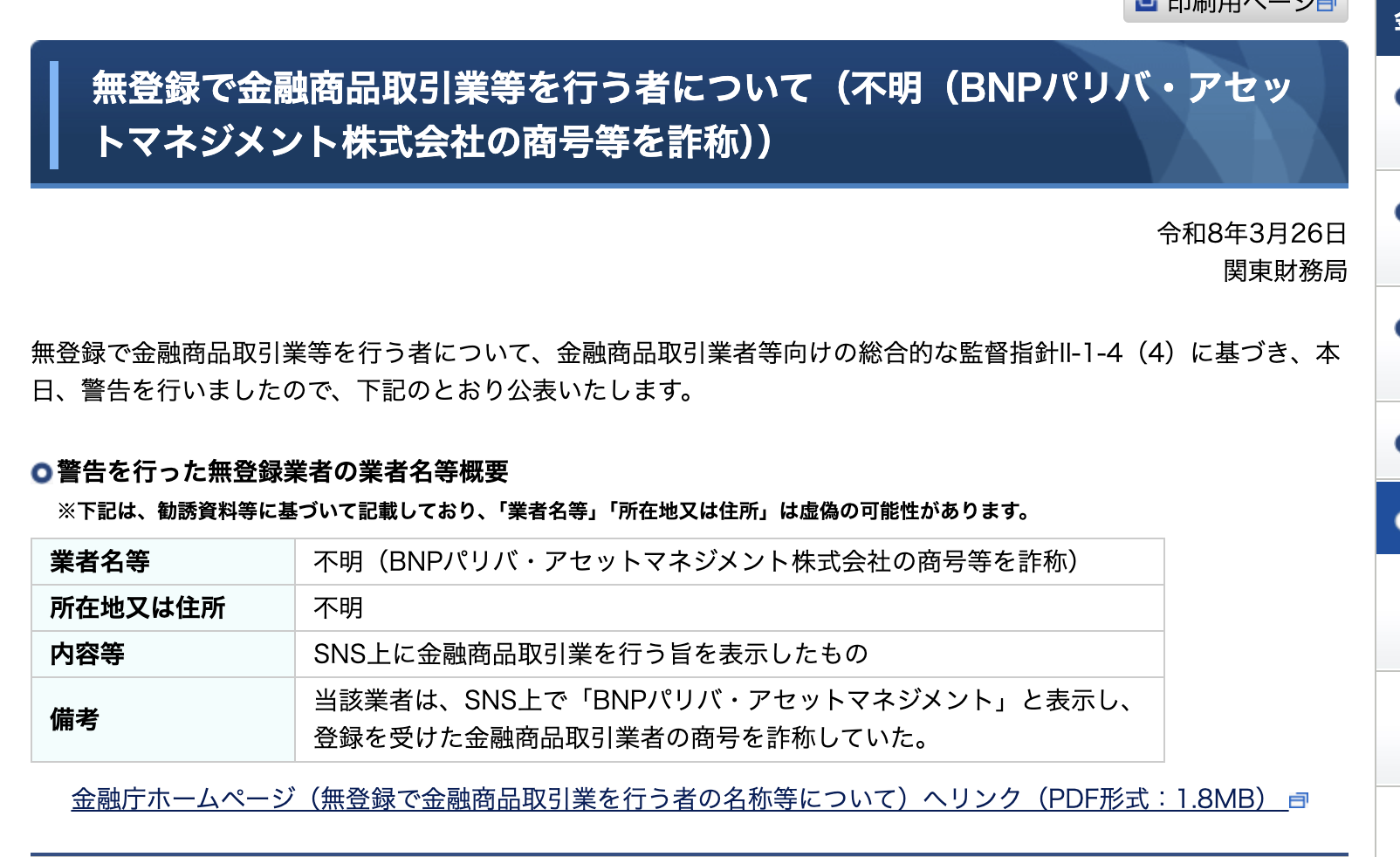 無登録で金融商品取引業等を行う者について(不明(BNPパリバ・アセットマネジメント株式会社の商号等を詐称))