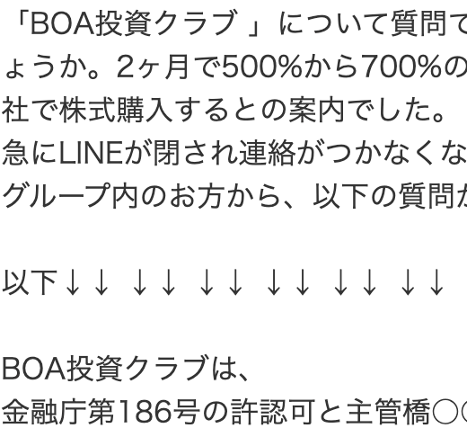 「BOA投資クラブ 」について質問です。 「BOA投資クラブ 」は、投資詐欺会社でしょうか。2ヶ月で500%から700%の利益を出す目標としてバンクオブアメリカ証券会社で株式購入するとの案内でした。