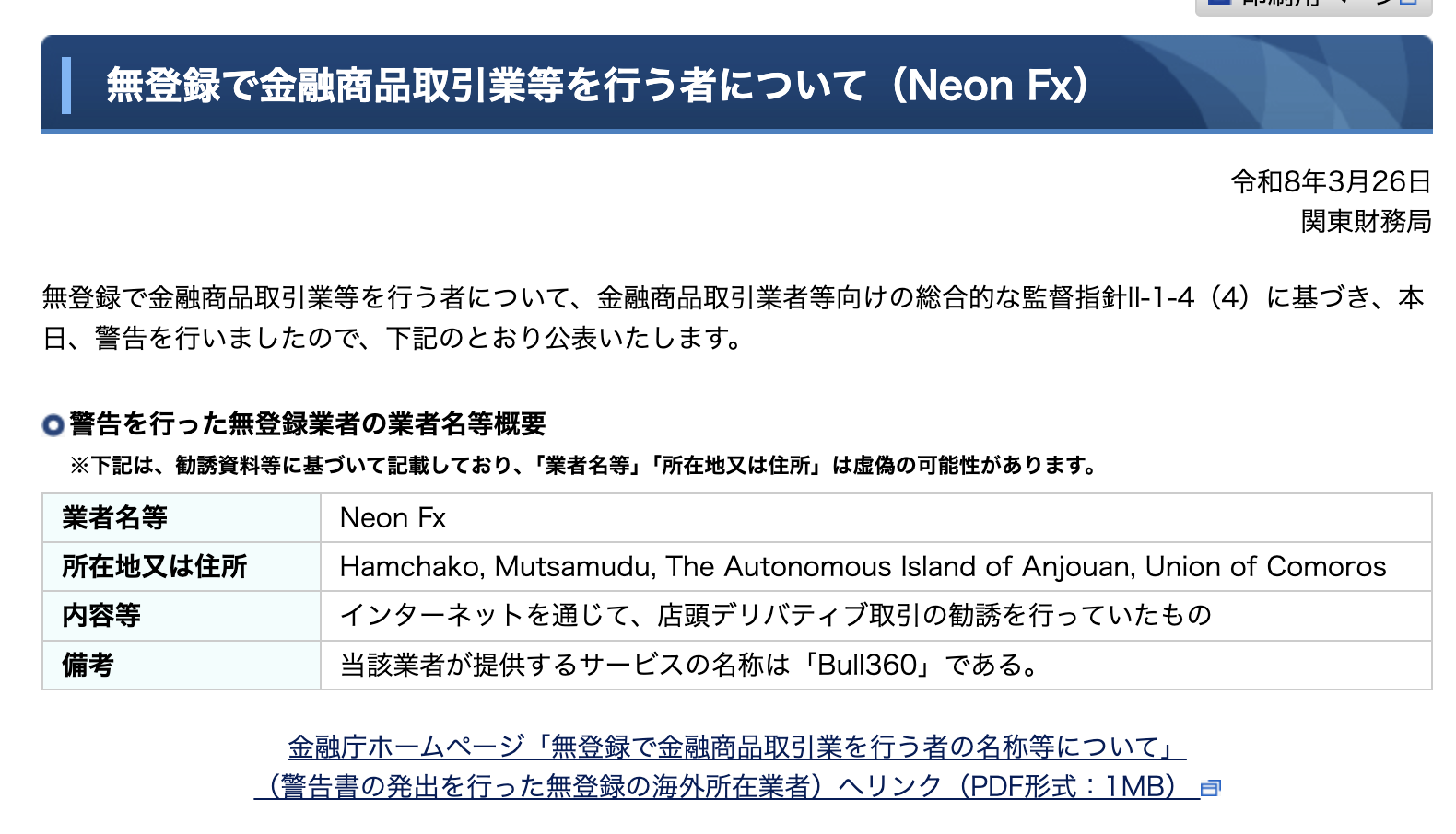 無登録で金融商品取引業等を行う者について(Neon Fx)