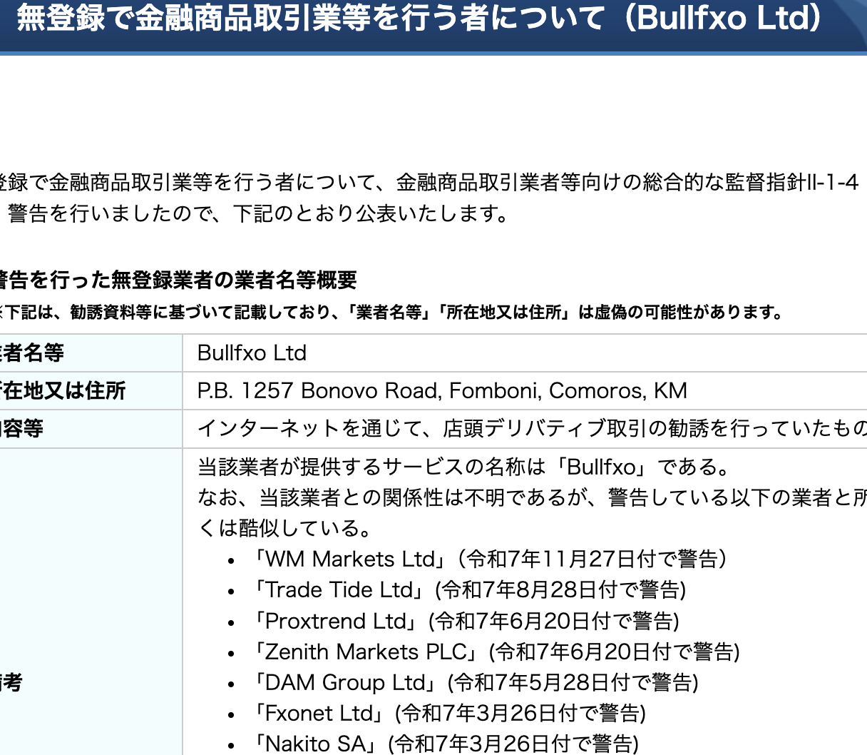 業者名等 Bullfxo Ltd 所在地又は住所 P.B. 1257 Bonovo Road, Fomboni, Comoros, KM 内容等 インターネットを通じて、店頭デリバティブ取引の勧誘を行っていたもの 備考 当該業者が提供するサービスの名称は「Bullfxo」である。