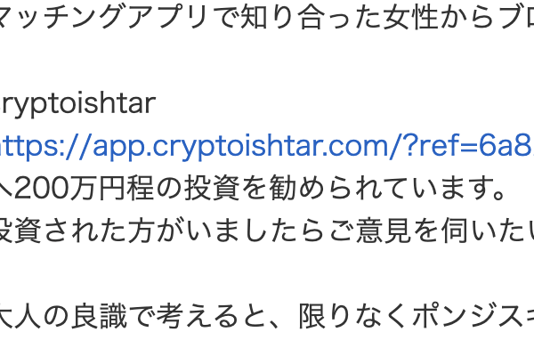 なぜ世の中の男性諸君はマッチングアプリで出会った女の投資の話を検討してしまうのでしょうね。このリンク見たらその女に手数料が入ることがわかるでしょうに。