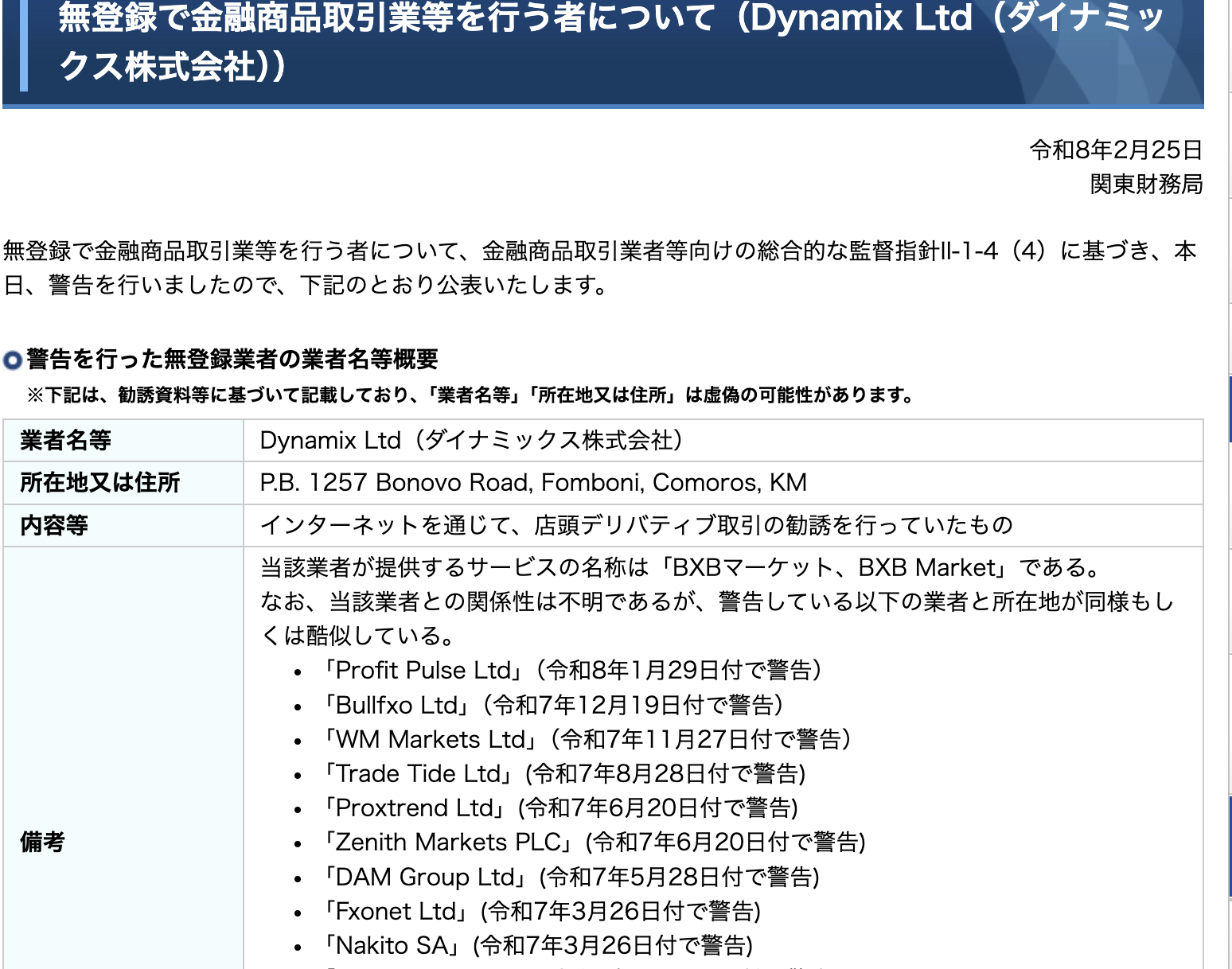 無登録で金融商品取引業等を行う者について(Dynamix Ltd(ダイナミックス株式会社))