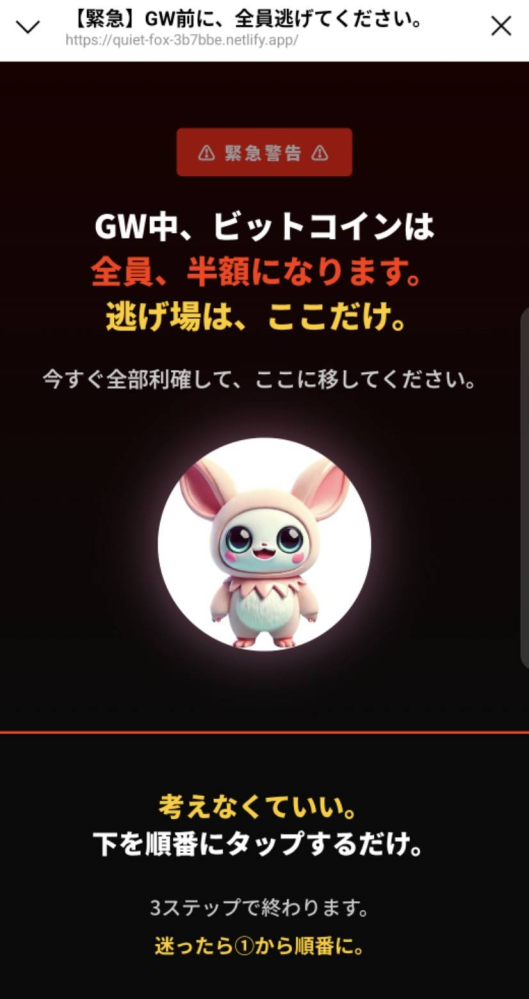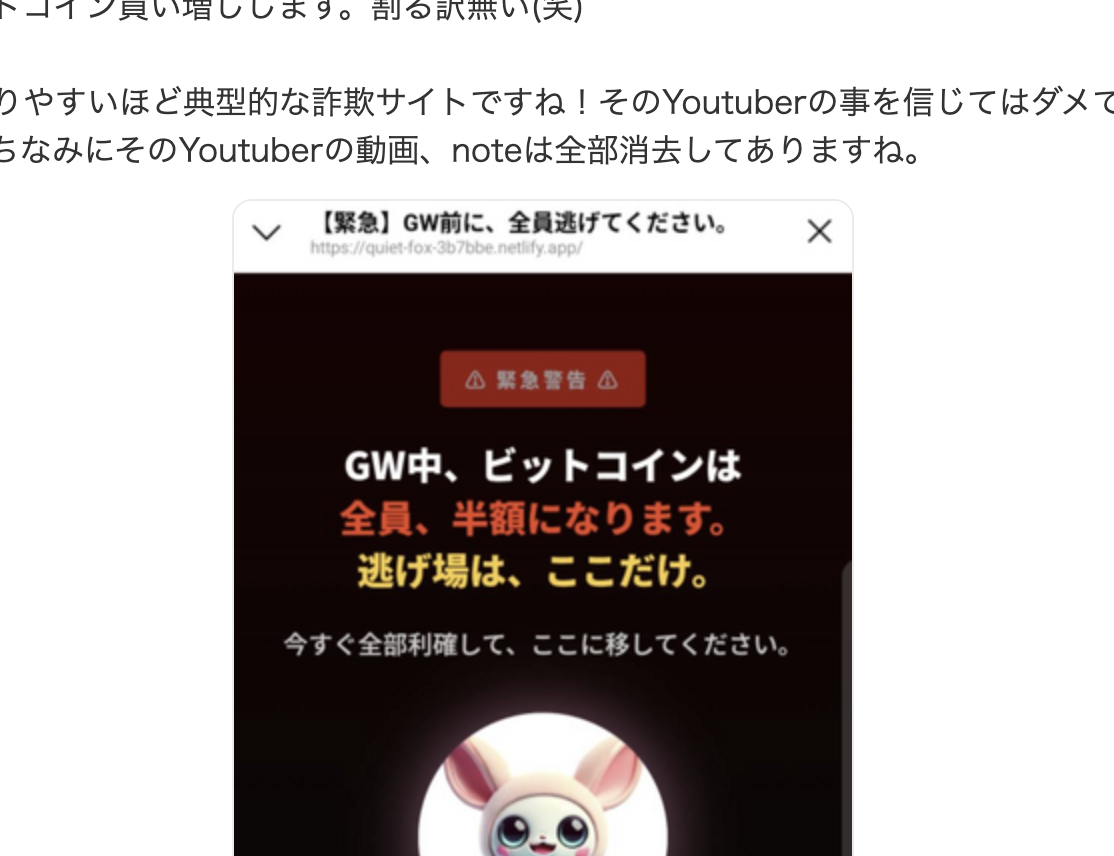 本当にビットコインが10,000ドル割ったら大チャンスです(笑)クルマ、家売ってでもビットコイン買い増しします。割る訳無い(笑)わかりやすいほど典型的な詐欺サイトですね!そのYoutuberの事を信じてはダメです。ちなみにそのYoutuberの動画、noteは全部消去してありますね。