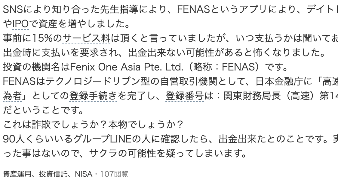 SNSにより知り合った先生指導により、FENASというアプリにより、デイトレードやIPOで資産を増やしました。