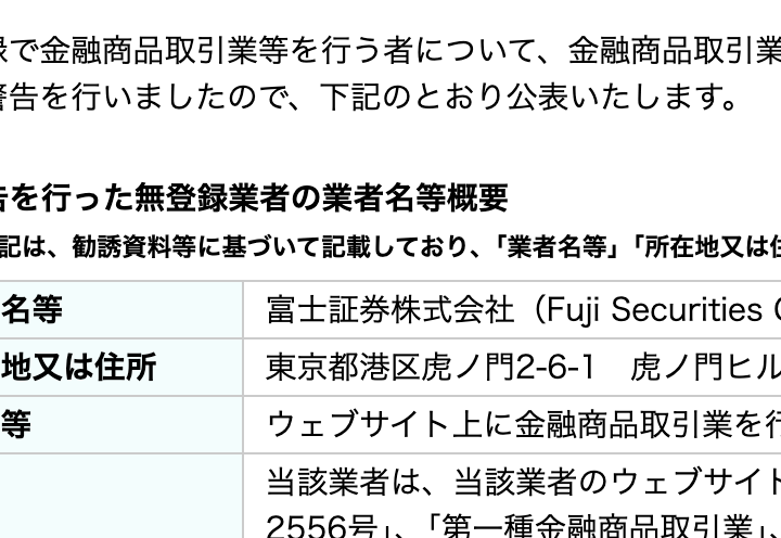 答え、結論を言うと、富士証券株式会社(Fuji Securities Co., Ltd.)は金融庁から警告を受けている無許可営業のサイトであり、利用価値はありません。