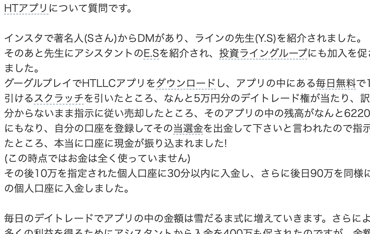 グーグルプレイでHTLLCアプリをダウンロードし、アプリの中にある毎日無料で1回引けるスクラッチを引いたところ、なんと5万円分のデイトレード権が当たり、訳が分からないまま指示に従い売却したところ、そのアプリの中の残高がなんと62200円にもなり、自分の口座を登録してその当選金を出金して下さいと言われたので指示したところ、本当に口座に現金が振り込まれました!