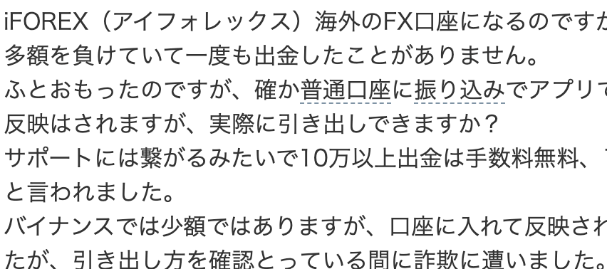 iFOREX(アイフォレックス)海外のFX口座になるのですが、だいぶやりましたが、多額を負けていて一度も出金したことがありません。