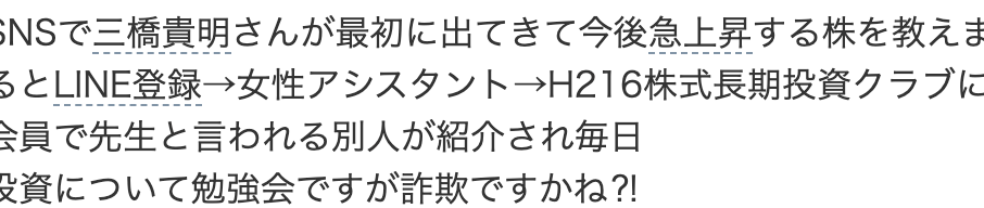 SNSで三橋貴明さんが最初に出てきて今後急上昇する株を教えますから始まり検索するとLINE登録→女性アシスタント→H216株式長期投資クラブに入会で80人くらいの会員で先生と言われる別人が紹介され毎日