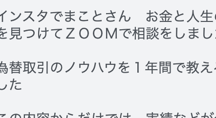 どうせYoutubeとかインスタあたりで名言集を見てラインに誘導されて個別でズーム面談、為替の短期売買のスクールが数十万で案内されてすぐに元がとれる、こんな案内でしょうねえ。