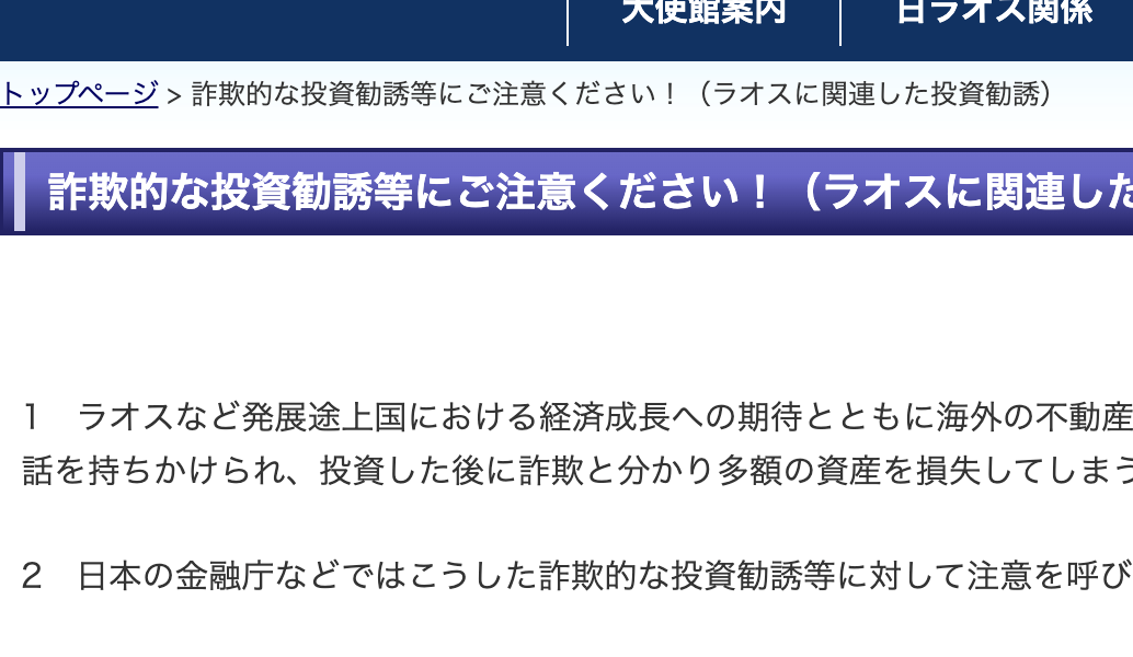 1 ラオスなど発展途上国における経済成長への期待とともに海外の不動産投資等が注目されていますが、「必ず儲かる」、「元本保証だから損しない」、「高い配当が得られる」などとオイシイ投資話を持ちかけられ、投資した後に詐欺と分かり多額の資産を損失してしまう被害が後を絶ちません。
