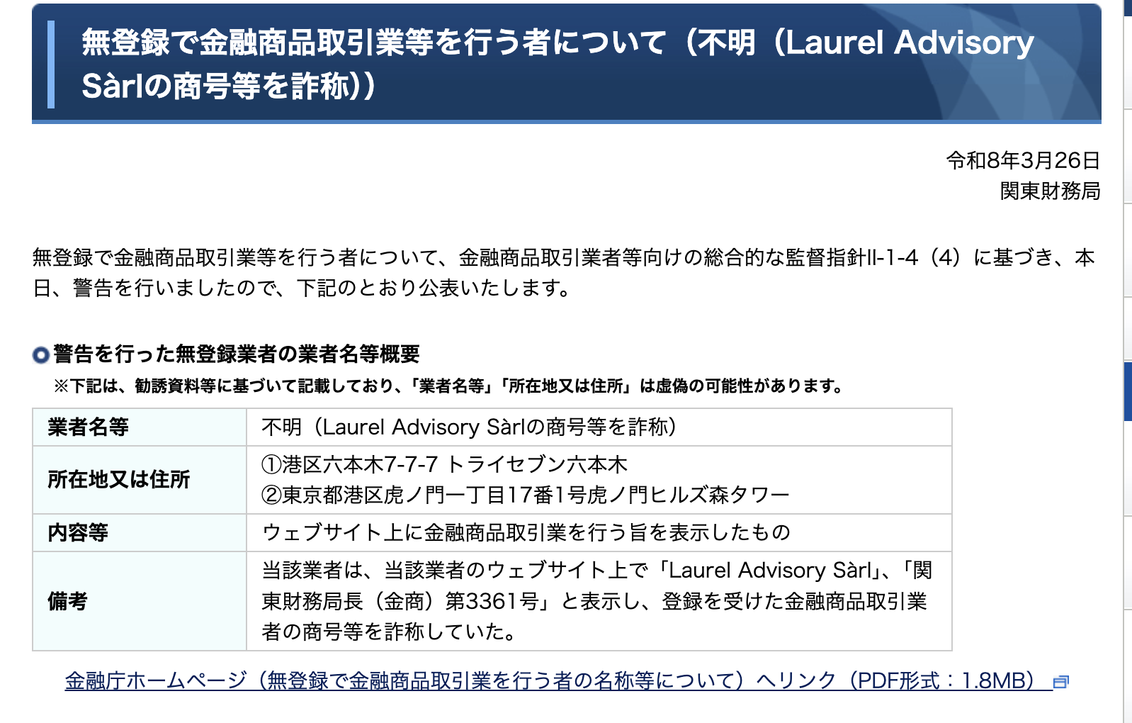 ②東京都港区虎ノ門一丁目17番1号虎ノ門ヒルズ森タワー内容等 ウェブサイト上に金融商品取引業を行う旨を表示したもの 備考 当該業者は、当該業者のウェブサイト上で「Laurel Advisory Sàrl」、「関東財務局長(金商)第3361号」と表示し、登録を受けた金融商品取引業者の商号等を詐称していた。 注意事項