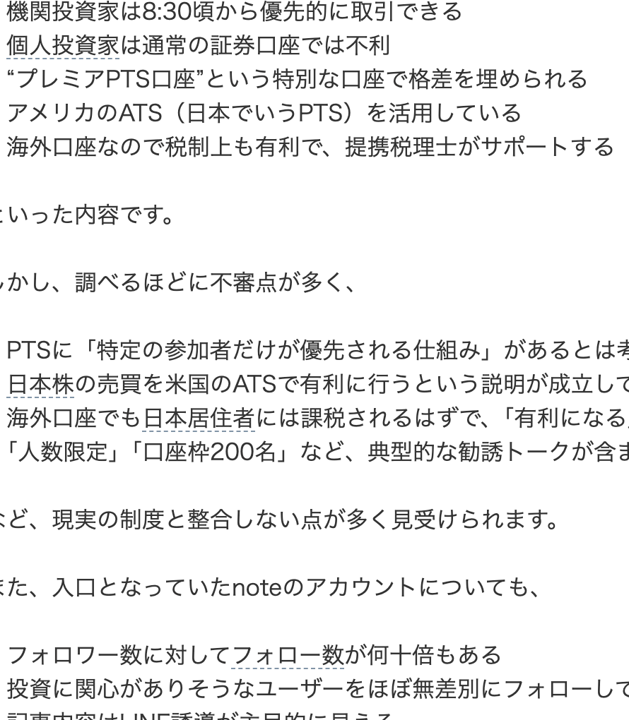 note経由でLINEの投資グループに誘導されるケースについて、注意喚起も兼ねて質問です。