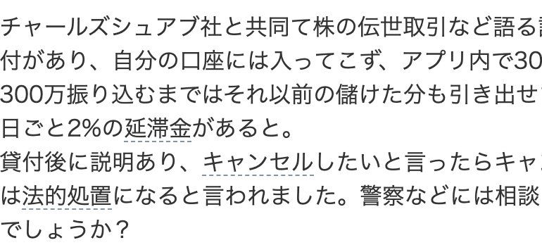 チャールズシュアブ社と共同て株の伝世取引など語る詐欺のようところから300万貸付があり、自分の口座には入ってこず、アプリ内で300万が入ってます。