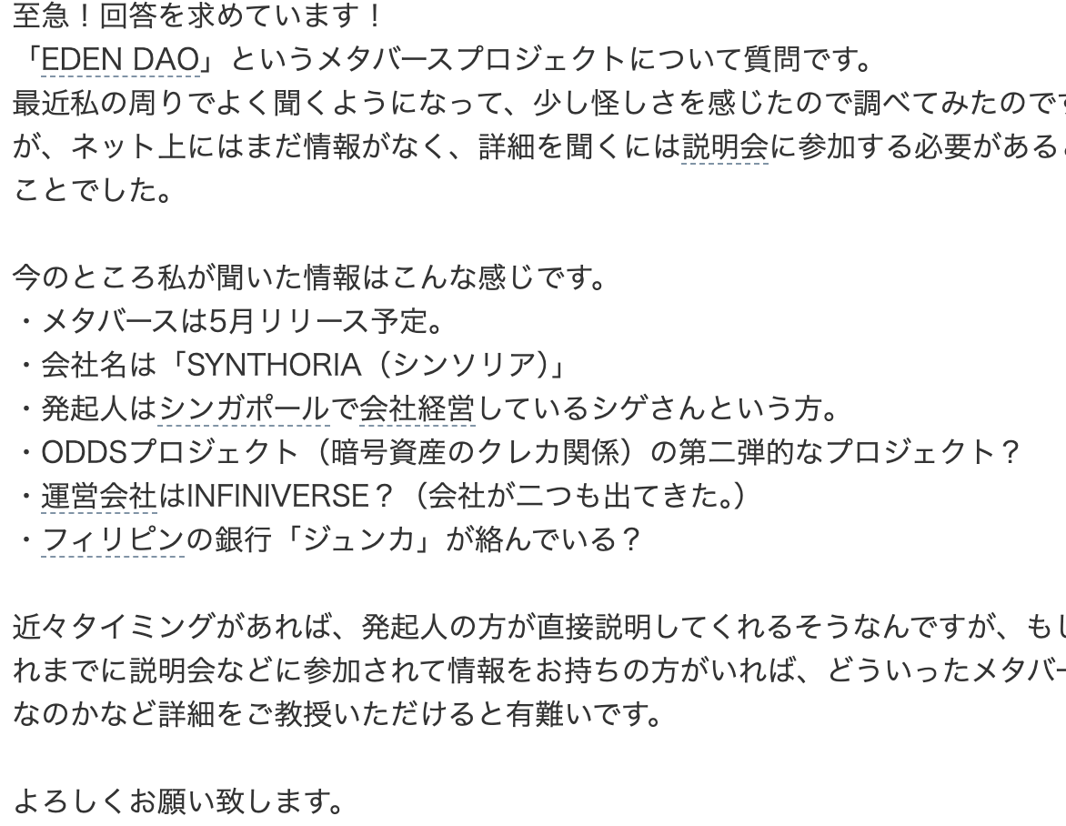 「EDEN DAO」というメタバースプロジェクトについて質問です。