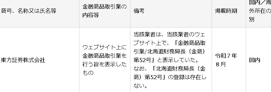 商号、名称又は氏名等 金融商品取引業の内容等 備考 掲載時期 国内/海外所在の別 東方証券株式会社 ウェブサイト上に金融商品取引業を行う旨を表示したもの 当該業者は、当該業者のウェブサイト上で、「金融商品取引業/北海道財務局長(金商)第52号」と表示していた。なお、「北海道財務局長(金商)第52号」の登録は存在しない。 令和7年8月 国内