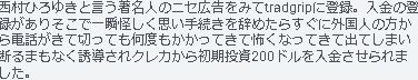 西村ひろゆきと言う著名人のニセ広告をみてtradgripに登録。入金の登録がありそこで一瞬怪しく思い手続きを辞めたらすぐに外国人の方から電話がきて切っても何度もかかってきて怖くなってきて出てしまい断るまもなく誘導されクレカから初期投資200ドルを入金させられました。
