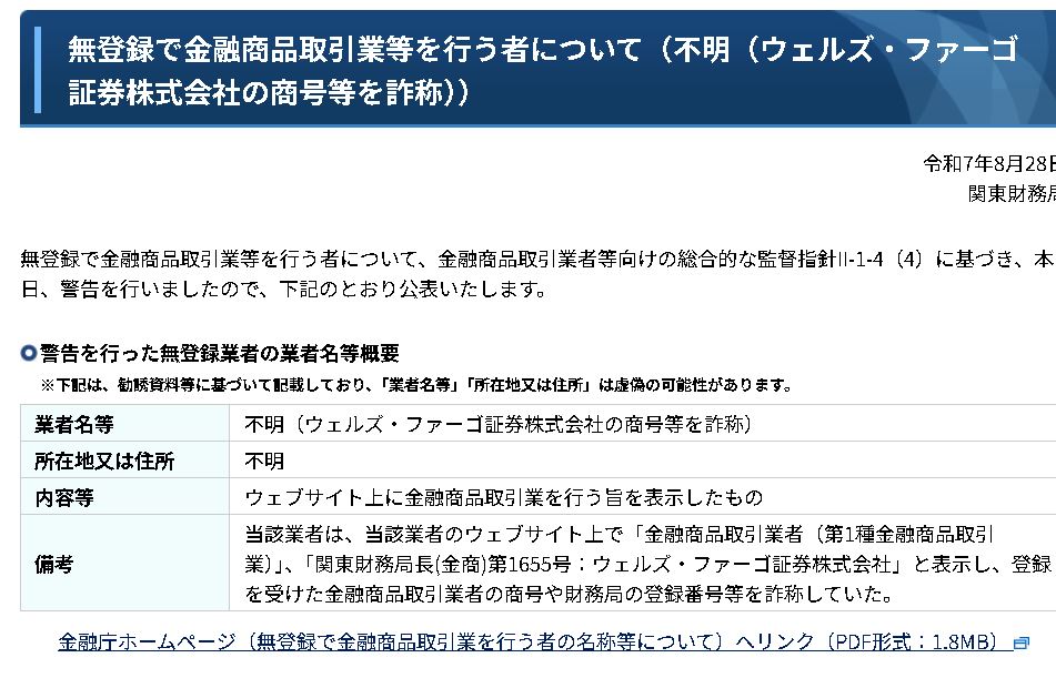 金融庁から警告、ウェルズ・ファーゴ証券株式会社の商号等を詐称した投資の評価・まとめ