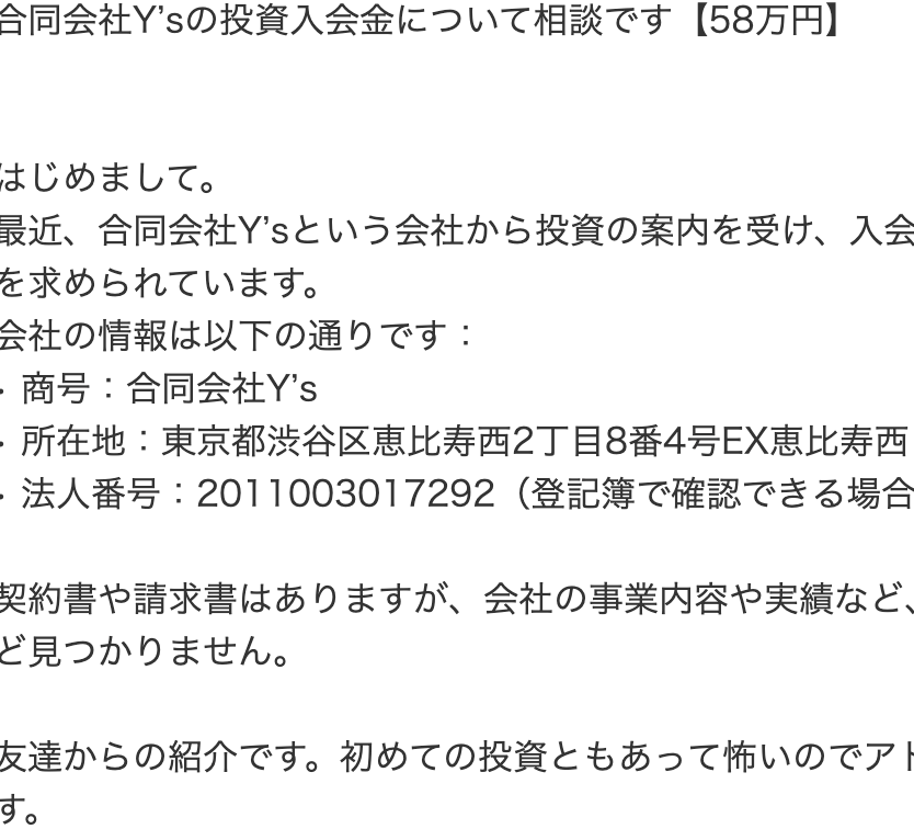 最近、合同会社Y’sという会社から投資の案内を受け、入会金として58万円の支払いを求められています。
