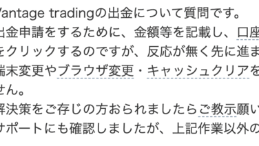 気になるネット上の口コミ(ヤフー知恵袋)Vantage tradingの出金について質問です。出金申請をするために、金額等を記載し、口座振り込みを選択後、「今すぐ出金する」をクリックするのですが、反応が無く先に進まずに出金できません。端末変...