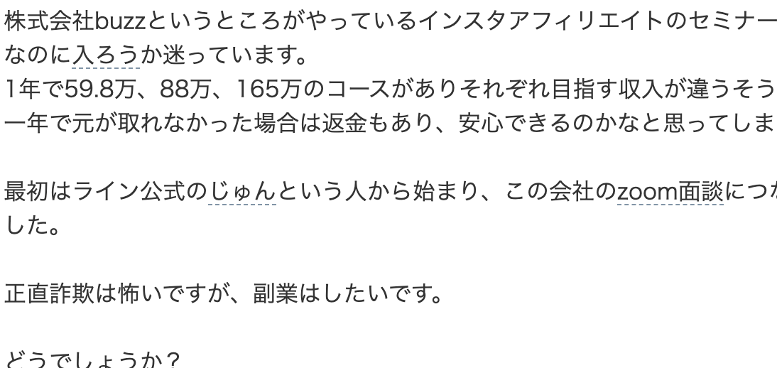 株式会社buzzというところがやっているインスタアフィリエイトのセミナー?みたいなのに入ろうか迷っています。