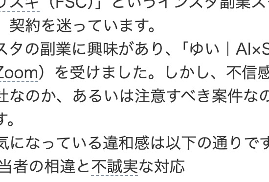 「フリスキ(FSC)」というインスタ副業スクールの実態や評判について。怪しい点が多く、契約を迷っています。