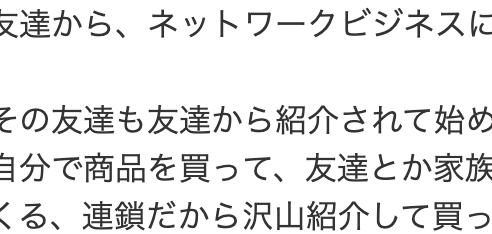 自分で商品を買って、友達とか家族とかに紹介してその広告費的なので報酬が入ってくる、連鎖だから沢山紹介して買ってもらえたらその分報酬がもらえるという感じでした。