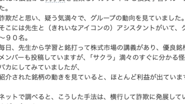 投資 SNSの広告から両学長を名乗るアカウントから投資学習グループ、機関口座とやらに振り込んではいけませんよ 気になるネット上の口コミ(ヤフー知恵袋)株式投資 LINEグループについて質問です。SNSの広告から両学長を名乗るアカウントから投資学習グループへ誘導がありました。詐欺だと思い、疑う気満々で、グループの動向を見ていました。そこには先生と(き... 2026.03.26 投資