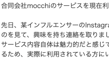 副業 合同会社mocchiの気になる口コミ 気になる口コミ(ヤフー知恵袋より)合同会社mocchiのサービスを現在利用されている方へ質問です。先日、某インフルエンサーのInstagramストーリーにてPR案件として紹介されているのを見て、興味を持ち連絡を取りました。サービス内容自体は... 2025.12.07 副業