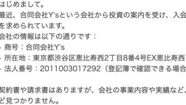 投資 合同会社Y’s(合同会社ワイズ)の投資入会金の気になる口コミ 気になるネット上の口コミ(ヤフー知恵袋)合同会社Y’sの投資入会金について相談です【58万円】はじめまして。最近、合同会社Y’sという会社から投資の案内を受け、入会金として58万円の支払いを求められています。会社の情報は以下の通りです:商号... 2025.11.02 投資