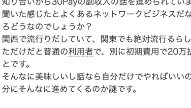 副業 30pay(サーティーペイ)の口コミと考えられる問題点 気になるネット上の口コミ(ヤフー知恵袋)こっち系詳しいかた教えてください!知り合いから30Payの副収入の話を進められています。聞いた感じたとよくあるネットワークビジネスだなと思っているのですが実際のところどうなのでしょうか?関西で流行りだ... 2026.03.23 副業