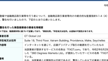 金融庁から警告 金融庁から警告、FXGT.comの投資には注意 あなたは今、FXGT.comの投資に興味を持ち、本当に稼げるのかを知りたいのではないだろうか?また、FXGT.comがどんな内容なのかを調べようとしているのではないだろうか?答え、結論を言うと、FXGT.comは金融庁から警告を受けている無... 2025.12.12 金融庁から警告