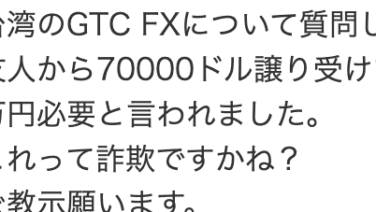 FX GTC FXに注意 気になるネット上の口コミ(ヤフー知恵袋)台湾のGTC FXについて質問します。友人から70000ドル譲り受けて、引き出そうとしたところ口座を活性化するため10万円必要と言われました。これって詐欺ですかね?ご教示願います。※※解説世の中のこう... 2025.10.31 FX