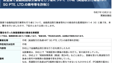 金融庁から警告 金融庁から警告、HRT SG PTE. LTD.の投資に注意 あなたは今、HRT SG PTE. LTD.の投資に興味を持ち、本当に稼げるのかを知りたいのではないだろうか?また、HRT SG PTE. LTD.がどんな内容なのかを調べようとしているのではないだろうか?答え、結論を言うと、HRT SG ... 2025.11.19 金融庁から警告