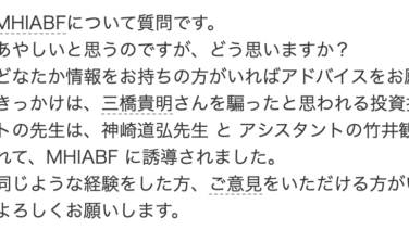 投資 MHIABF、神崎道弘と竹井観鈴に注意 気になるネット上の口コミ(ヤフー知恵袋)MHIABFについて質問です。あやしいと思うのですが、どう思いますか?どなたか情報をお持ちの方がいればアドバイスをお願いします。きっかけは、三橋貴明さんを騙ったと思われる投資指南サイト、コニュニティー... 2026.04.20 投資