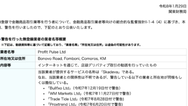 金融庁から警告 金融庁から警告、Profit Pulse Ltdの投資には注意 あなたは今、Profit Pulse Ltdの投資に興味を持ち、本当に稼げるのかを知りたいのではないだろうか?また、Profit Pulse Ltdがどんな内容なのかを調べようとしているのではないだろうか?答え、結論を言うと、Profit ... 2026.02.26 金融庁から警告