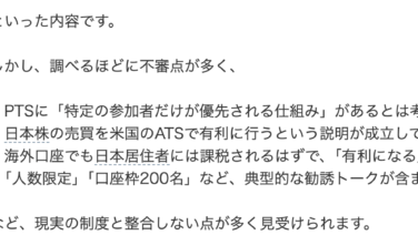 投資 note経由でLINEの投資グループに誘導される機関口座、PTS、ATSについて、そんなものはありませんので注意です 気になるネット上の口コミ(ヤフー知恵袋)note経由でLINEの投資グループに誘導されるケースについて、注意喚起も兼ねて質問です。最近、「PTSを使えば機関投資家と同じように寄り付き前に有利な価格で株を取得できる」「プレミアPTS口座を使え... 2026.03.26 投資
